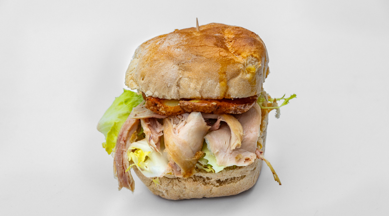 Sandwich avec le pain portugais ainsi que du jus de cuisson du poulet, de la salade, du poulet rôti effilocher et trois quatre frite pour le croustillant